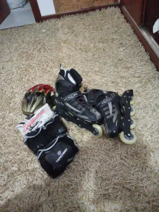 Conjunto de patines Fila en color negro, ideal para disfrutar del patinaje. - Patines Fila. - Casco de protección. - Protecciones para rodillas y codos.