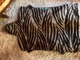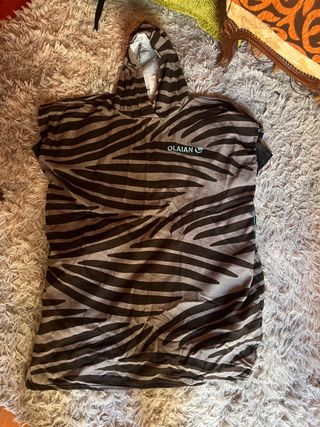Poncho con estampado de cebra de la marca Olaian. Ideal para cambiarse después de nadar o para la playa. - Diseño con capucha. - Mangas cortas. - Estampado de cebra en tonos grises y negros.