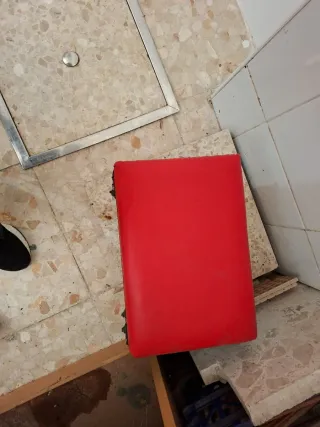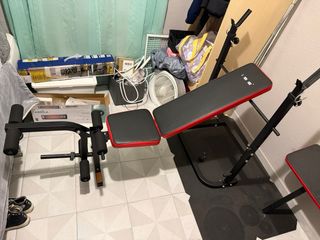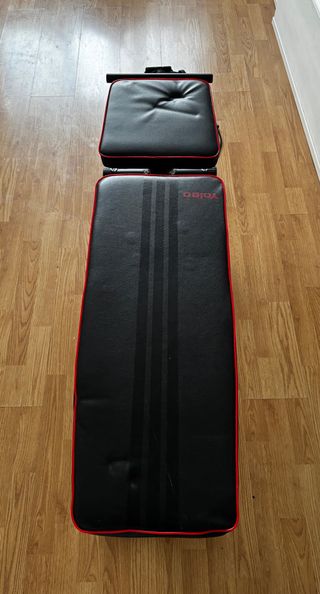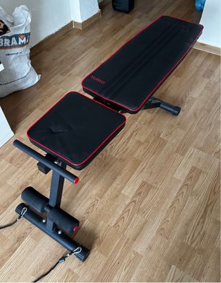 Banco de pesas ajustable de la marca Yoleo, ideal para entrenamientos en casa. Su diseño permite varias posiciones para adaptarse a diferentes ejercicios. - Tapicería negra con ribetes rojos. - Estructura metálica robusta. - Ruedas para las piernas acolchadas. ⚠️ Acolchado de asiento algo deformado, no afecta para nada a su uso. De ahí su precio.