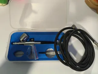 Kit de aerógrafo con compresor portátil y recargable. - Compresor con batería integrada. - Diseño compacto y ligero. - Indicadores LED de nivel de carga y potencia. - Incluye juego de juntas de repuesto. - Pipetas nuevas de regalo. Muy poco uso, ideal para empezar a hacer cosas con aerógrafo. Vendo por falta de uso.