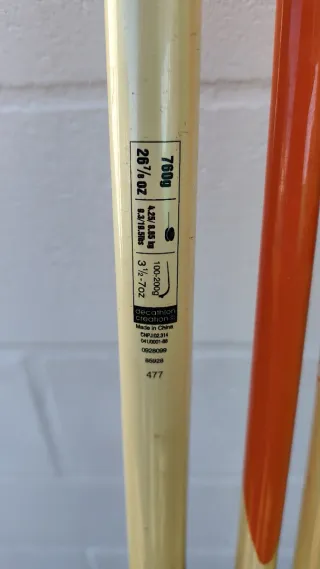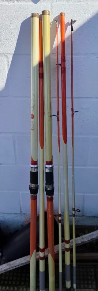 Se venden dos cañas de surf casting. - Color principal crema con detalles en naranja y rojo. - Empuñaduras negras con detalles metálicos.