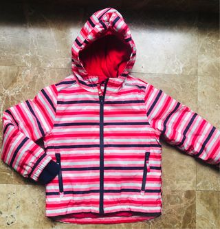 Chaqueta con capucha para niña, ideal para actividades al aire libre con frio. - Cremallera frontal. - Puños elásticos en las mangas. Chaquetón de nieve niña. En perfecto estado, como nuevo. Muy abrigado. Repele el agua y la humedad. Incluye faldon antinieve y puños para que no entre el frio por ningun lado. Con capucha. Por lo que es perfecto para esquiar o pasar el dia jugando en la nieve. Diseño precioso de rayas rosa fucsia, rosa chicle, rosa bebé y blanco reflectante con azul marino. Acolchado de buena calidad Perfecto estado La talla indica de 4 a 6 años. 110cm a 116cm Hago envios rapidos