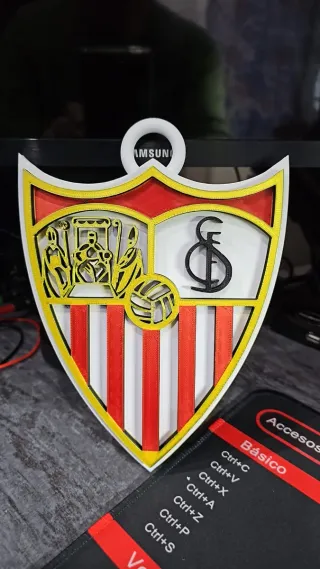 Escudo decorativo del Sevilla FC, realizado en impresión 3D con Bambulab A1, ideal para decorar. - Alto 20x ancho 16x fondo 1,2cm. - Incluye un aro para colgar.