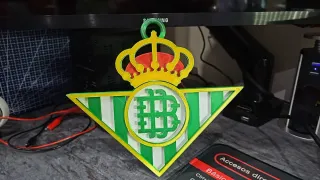 Escudo decorativo del Real Betis Balompié, ideal para aficionados. - Diseño fabricado en impresión 3D con Bambulab A1. - Alto 19x ancho 21x fondo 1,2cm. - Incluye aro para colgar.