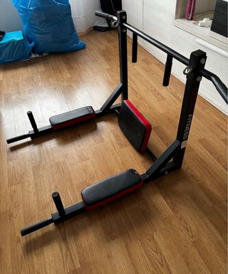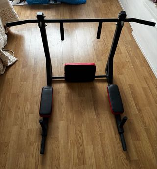 Soporte de pared para ejercicios de dominadas con diseño reversible. Puedes entrenar dominadas, fondos y abdominales 💪🏻 - Estructura de metal negro. - Acolchado en color rojo y negro.