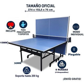 Mesa de ping pong de tamaño oficial, ideal para principiantes y expertos. Perfecta para jugar en interiores. - Tamaño oficial: 274 x 152,5 x 76 cm. - Grosor de la superficie: 15 mm. - Grosor del borde: 30 mm. - Soporta hasta 200 kg. - Equipada con 8 ruedas (4 bloqueables). Solo se ha usado dos veces de regalo - dos palas usadas y un juego de bolas decatlón -Marcador digital Enebe nuevo sin usar -Dos palas Tibhar 5 estrellas dos usos -Red profesional dos usos -Funda palas y pelotas -Funda de mesa cornilleou - dos paquetes de bolas 3 estrellas Se puede vender la mesa sola con un juego de palas y bolas decatlón por 250€