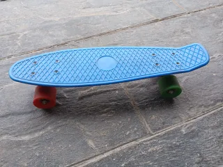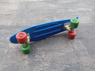 Patineta clásica de color azul, ideal para pasear y divertirse. - Tabla de plástico resistente. - Ruedas de colores (rojas y verdes). - Diseño antideslizante en la superficie.
