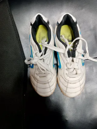 Zapatillas de fútbol para niño/a en talla 32. Perfectas para entrenar y jugar. - Color blanco con detalles azules. - Cierre con cordones. - Suela apta para césped artificial o moqueta. Cómo se ve en las fotos