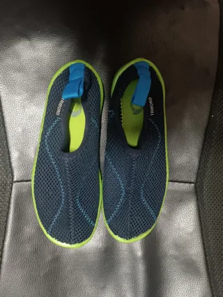 Zapatos de playa para niños de la marca Tribord. - Talla 30. - Diseño en azul y verde lima. - Material de malla transpirable.