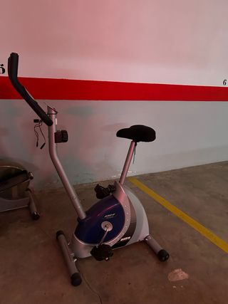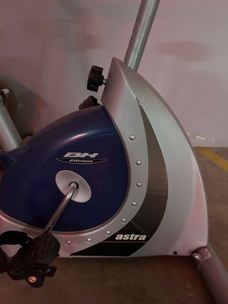 Bicicleta estática de la marca BH, modelo Astra Fitness. Diseñada para entrenamientos en casa. - Color azul y plateado. - Asiento ajustable. - Pedales con agarre.