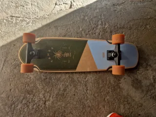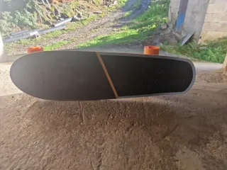 Skate con diseño moderno y ruedas llamativas. - Tabla de color negro con detalles en madera. - Ruedas de color naranja.