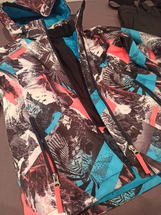 Conjunto de chaqueta (CMP Temporada 2025) y pantalón de esquí (Mckinley temporada 2025) para niño, talla 140 cm. (8-10 años). Precio conjunto nuevo en tienda: 135 euros. 3 usos durante el invierno de 2025. - Chaqueta con estampado multicolor. - Pantalón negro con tirantes.