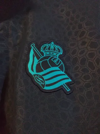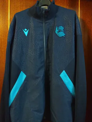 Sudadera deportiva de la Real Sociedad. - Color azul marino con detalles en turquesa. - Logo de Macron en el pecho. - Escudo del club en el pecho. - Diseño con estampado texturizado. - Cremalleras en los bolsillos