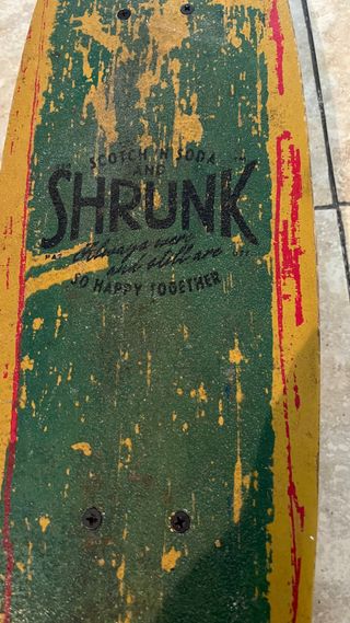 Monopatín vintage con diseño desgastado. - Marca: Scotch Soda Shrunk - Diseño con detalles en verde y amarillo - Ideal para coleccionistas o decoración
