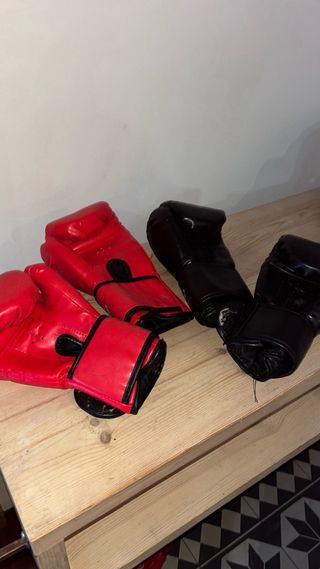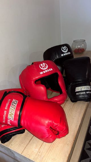 Conjunto de equipo de boxeo que incluye guantes y casco. - Guantes de boxeo en color rojo. - Casco de boxeo en color rojo. - Casco de boxeo en color negro. - Guantes de boxeo en color negro.