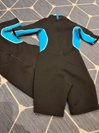 Traje de neopreno para niño, ideal para actividades acuáticas. El de talla 8 está usado un par de veces y el de talla 10 está sin estrenar. 8 EUROS LA UNIDAD - Color principal negro con detalles en azul. - Cierre de cremallera frontal. - Mangas cortas y perneras cortas.