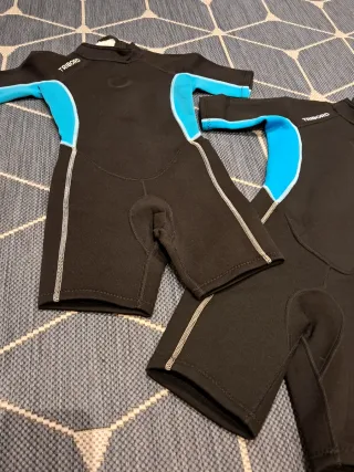 Neopreno marca Tribord, uno en talla 8 y otro en talla 10. Perfectos para actividades acuáticas. El de talla 8 está usado un par de veces y el de talla 10 está sin estrenar. Cada uno 8 euros - Color principal negro con detalles en azul. - Diseño de manga corta y pernera corta.