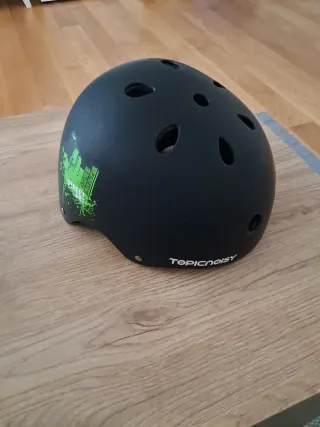Casco negro para patinaje o skate. Diseño moderno con ventilación. - Color negro mate. - Diseño con estampado urbano verde. - Marca TOPICNOISY visible.
