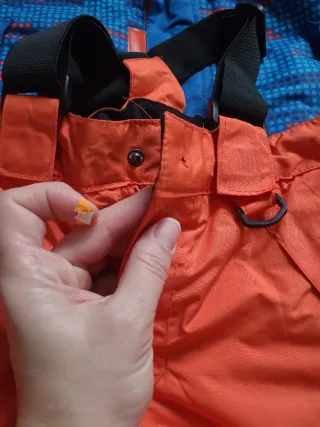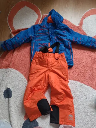 Conjunto de esquí para niños, marca Lupilu. - Chaqueta azul con detalles a cuadros en naranja y azul. - Pantalón de tirantes naranja con tirantes, le falta el remache para atar (ver foto)