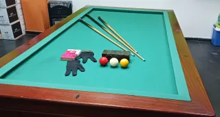 Mesa de billar de Roble macizo estilo francés, ideal para disfrutar en casa o en local. Las bandas se cambiaron a finales del 2024 poco uso y se instalo calefaccion en las bandas. - Forro de protección. - Superficie de juego verde. - medidas 1.30mt ancho x 2.30mt de largo x 80 de alto. Superficie de juego 2mt / 1mt. -incluye el contador de carambolas y la taquera. - Estructura de madera de roble macizo - Incluye 1 taco normal, 2 tacos cortos para espacios reducidos, bolas, tisas y un par de guantes nuevos. - La mesa va excelente. - La puedes transportar sin desarmar en furgoneta.