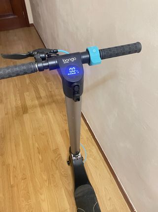 Patinete eléctrico Bongo de Cecotec en color gris y negro. - Manillar con puños texturizados. - Pantalla LED integrada. - Freno de mano. - Botón de encendido azul.