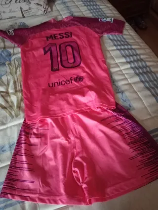 Conjunto de fútbol infantil de color rosa. - Camiseta con escudo del FC Barcelona y logo de Rakuten. - Pantalón corto a juego con escudo del FC Barcelona y logo de Nike. - Talla 164 - Se regala camiseta