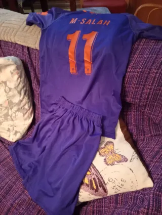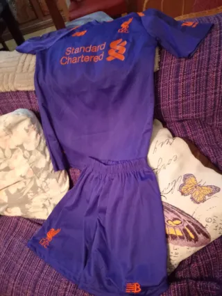 Conjunto de fútbol para niños del Liverpool FC. - Camiseta y pantalón corto de color morado. - Logo del equipo en naranja. - Patrocinador Standard Chartered en la camiseta. - Logo de New Balance en el pantalón. - Talla 176