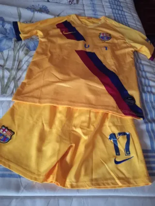 Conjunto de camiseta y pantalón corto de fútbol para niños. - Camiseta de color amarillo con detalles en azul y granate. - Escudo del FC Barcelona en la camiseta y en el pantalón. - Número 17 en el pantalón. - Talla 28