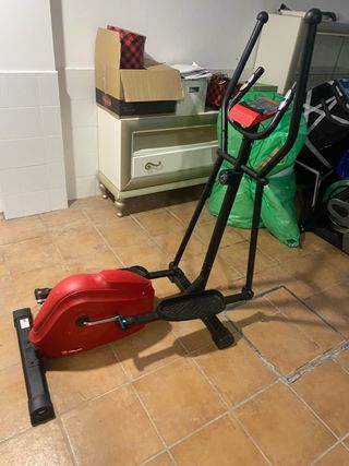 Bicicleta elíptica de color rojo, ideal para entrenamientos en casa. - Diseño compacto. - Manillar ergonómico. - Pantalla digital.