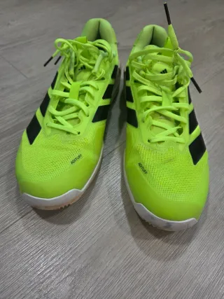 Zapatillas de tenis Adidas Adizero Ubersonic 5 en llamativo color verde neón. 44 2/3 Usadas 3 veces Suela clay - Diseño deportivo con las icónicas tres rayas de Adidas en negro. - Tecnología ADITUFF en la puntera para mayor durabilidad. - Cordones verdes a juego con la zapatilla.