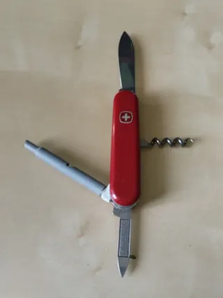 Navaja multiusos de la marca Wenger con el icónico diseño suizo. - Mango de color rojo brillante. - Incluye hoja principal, sacacorchos, lima y silbato.