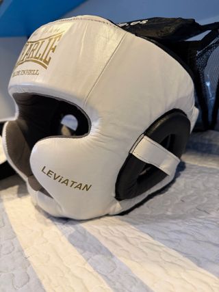 Casco de protección para kick boxing, marca Leviathan. - Color blanco con detalles dorados. - Diseño de cobertura completa. - Cierre ajustable.