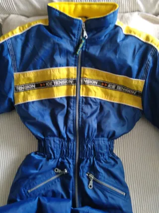 Traje de esquí infantil de color azul y amarillo, talla 128 (aproximadamente 8 años). - Diseño deportivo con detalles en amarillo. - Cremallera frontal. - Bolsillos con cremallera.