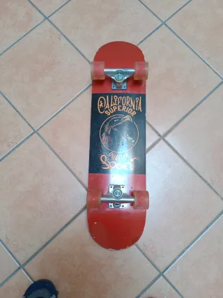 Monopatín listo para usar. - Superficie de agarre negra. - Diseño alargado y curvo en los extremos.