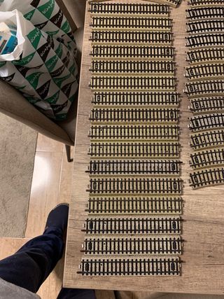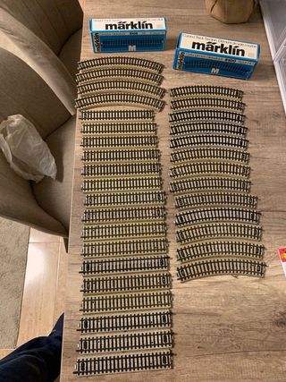 Conjunto de vías para trenes a escala HO de la marca Märklin. Incluye tramos rectos y curvos.A 1€ unidad o lote por 30€.los arbolescon el lote -Vias curvas Marklin 4 diferentes . - Vías rectas Märklin 5106.16 piezas - Vías curvas Märklin 5100.13 piezas