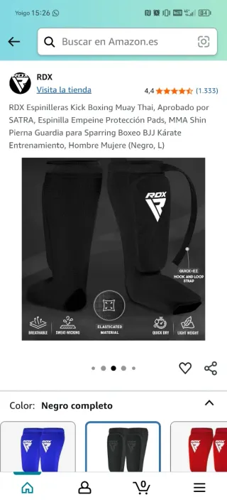 Espinilleras RDX para deportes de combate como kick boxing, muay thai, MMA y BJJ. Diseñadas para entrenamiento y sparring. - Color: Negro. - Talla: L. - Material: Tejido elástico y transpirable. - Cierre: Velcro Quick-EZ. - Aprobadas por SATRA.