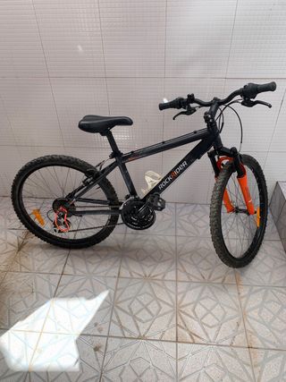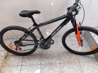 Bicicleta de montaña Rockrider con ruedas de 24 pulgadas. - Cuadro de aluminio. - Suspensión delantera. - Frenos de pastilla , timbre y caballete . - Cambio Shimano.Venta en mano no envio.