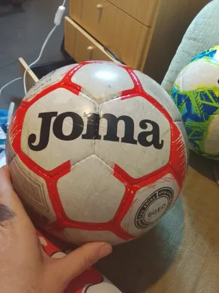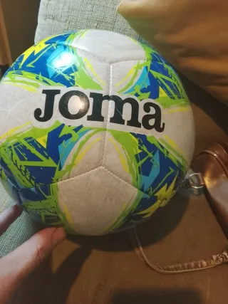 Balón de fútbol con diseño llamativo y vibrante. - Marca: Joma - Colores: Blanco, azul, verde y amarillo - Diseño con formas geométricas y líneas.