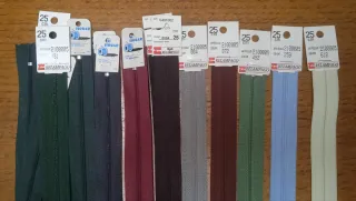 Lote de 20 cremalleras de 25 cm de largo. Vienen en varios colores: 9 verde oscuro. 2 gris oscuro. 2 burdeos. 1 marrón. 1 gris claro. 1 color teja. 1 verde claro. 2 celeste. 1 beige. - Cremalleras de la marca RELAMPAGO y HOGAR.
