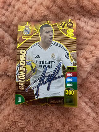 Tarjeta de fútbol de Kylian Mbappé, edición Balón de Oro. - Tarjeta firmada por el jugador. - Incluye número de serie 522. - Diseño especial conmemorativo. - Puntuaciones: Ataque 100, Defensa 100, Control 100, Total 300.