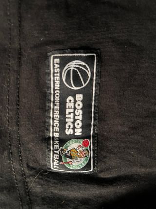 Camiseta negra de los Boston Celtics de la NBA. Presenta el nombre del equipo y Basketball en la parte delantera. - Diseño con rayas verdes y blancas en las mangas. - Logo de la NBA en la etiqueta. - Etiqueta oficial de los Boston Celtics en la parte inferior.