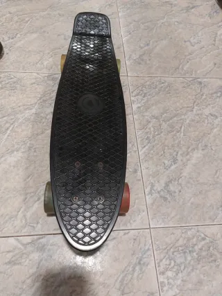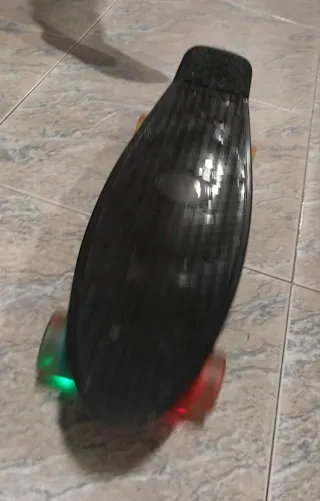 Monopatín de la marca Deleven en color negro. - Ruedas de colores y luces variadas: amarillas, verdes, azules y rojas. - Diseño clásico de monopatín. - Base con logo de la marca.
