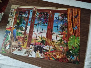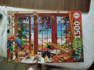 Puzzle de la marca Educa con 1500 piezas, que representa una escena vibrante de pájaros y naturaleza. - Diseño detallado de loros, tucanes y flamencos. - Vista de una playa tropical a través de una ventana.