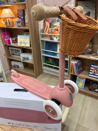 PRODUCTO NUEVO. Patinete infantil Banwood en color rosa, ideal para los más pequeños. Fabricado con materiales sostenibles. - Estructura de 100% plástico reciclado. - Ruedas blancas. - Cesta de mimbre. - Puños de goma.