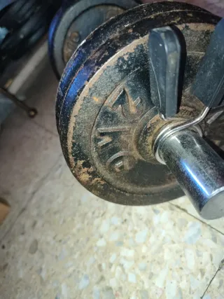 Mancuerna con discos de peso para entrenamiento. - Barra con agarre texturizado. - Discos de hierro fundido. - Cierres de rosca para asegurar los discos. - 4 discos de hierro de 4 kilos y otros 4 discos de 1 kilo - Máquina para pedalear en casa El precio depende de lo que se lleveis , si es el lote obviamente será más económico, preguntar sin compromiso