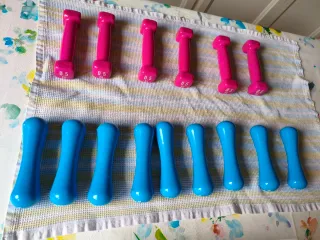Lote de 15 pesas de 0.5kg cada una. Ideales para entrenamientos ligeros. - Color azul y rosa. - Peso: 0.5 kg por pesa.