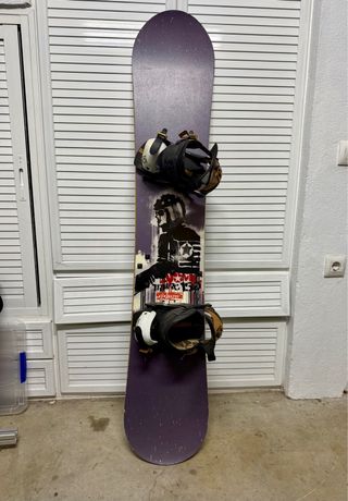 Tabla de snowboard con un diseño llamativo en morado y gráficos en la parte central. - Fijaciones incluidas. - All mountain, para todos los terrenos y usos.