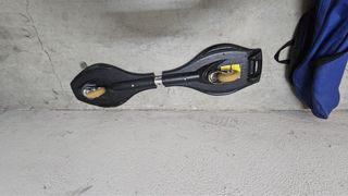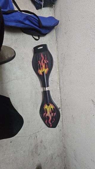 Patin de dos ruedas con un diseño llamativo de llamas en cada tabla. Ideal para deslizarse y divertirse. - Diseño de llamas en rojo, amarillo y naranja. - Dos tablas conectadas por un eje central.