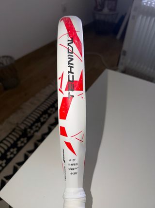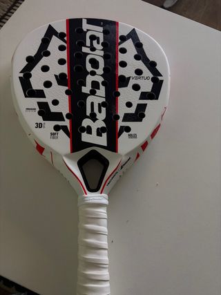 Pala de pádel Babolat Vertuo en color blanco con detalles en rojo y negro. Diseñada para un juego versátil. - Tecnología Vibraabsorb System. - Superficie Soft Fiber. - Agujeros Holes Technology.