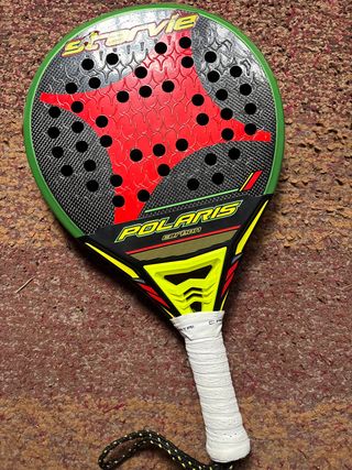 Pala de pádel Starvie Polaris Carbon con un diseño llamativo en rojo, negro y verde. Ideal para jugadores que buscan control y potencia. - Pala de pádel Starvie - Modelo Polaris Carbon - Diseño con estrella roja - Marco verde - Empuñadura blanca